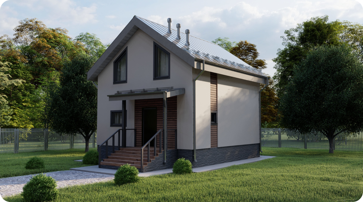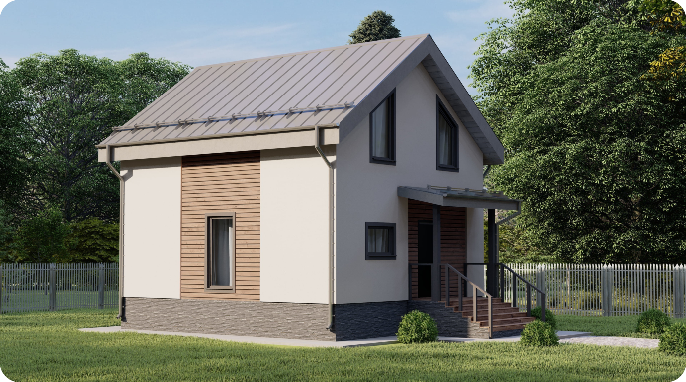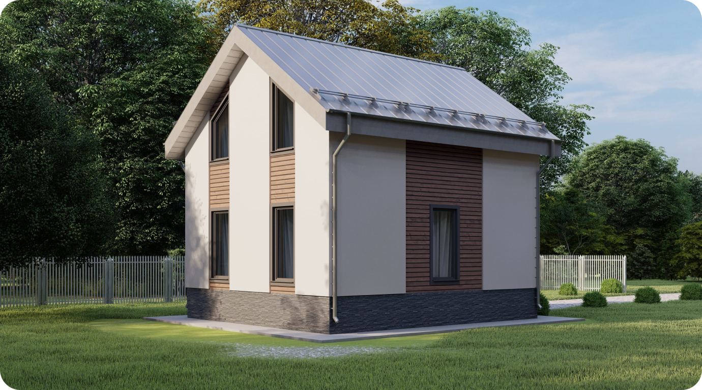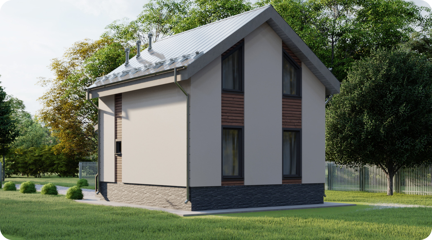 Благодаря своему дизайну он выглядит компактным и весьма презентабельным внешне. При этом из внешних особенностей проекта можно выделить окна мансардного этажа, которые повторяют геометрию двускатной крыши.