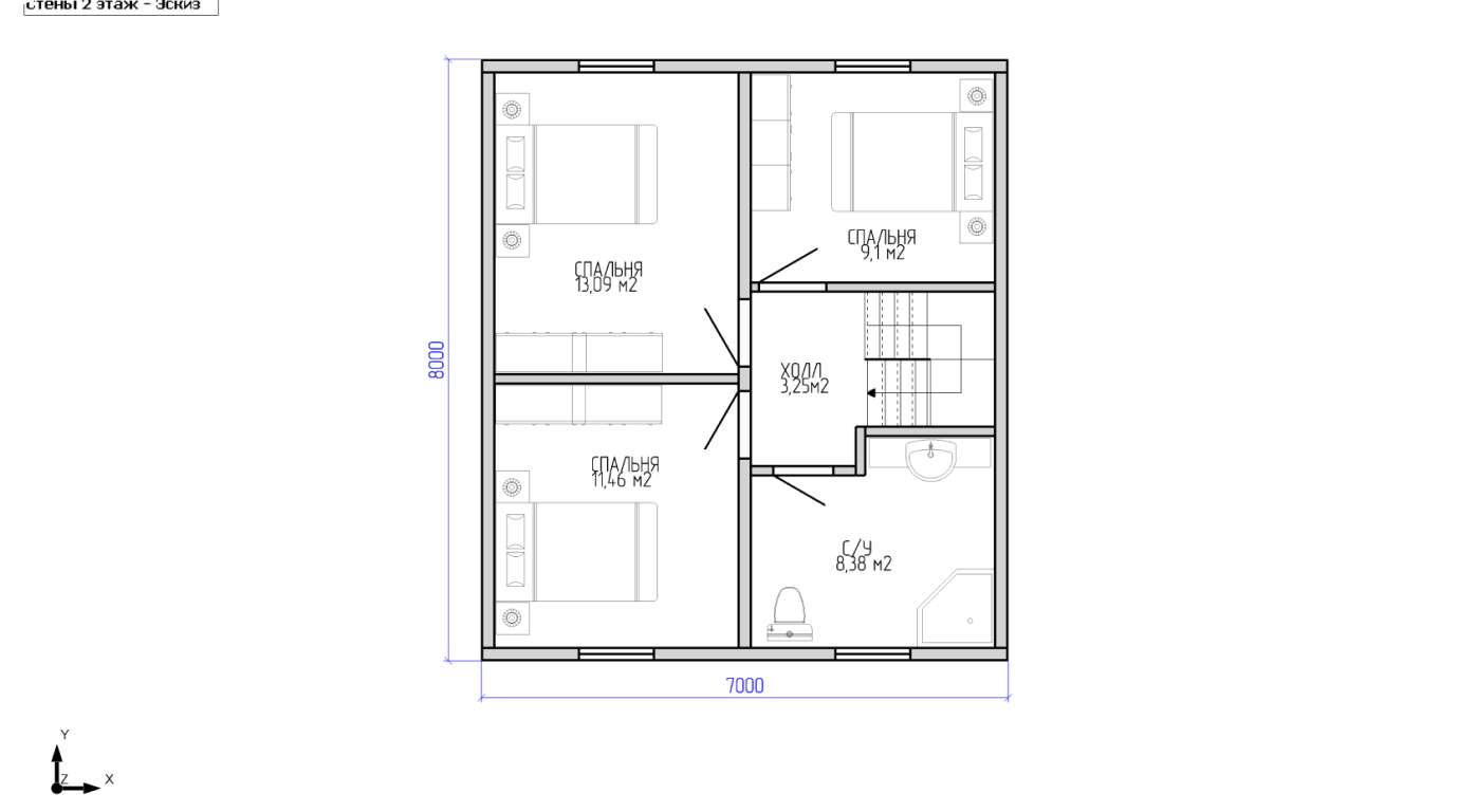 Проектом предусмотрено четыре спальни. Три на втором этаже и одна на первом. Хотя это и мансардный дом, но места в спальнях второго этажа более чем достаточно. На втором этаже также размещен просторный санузел. Все помещения мансардного этажа соединяет небольшой холл. Лестница расположена таким образом, чтобы с одной стороны обеспечить визуальный простор для холла, а с другой – максимально эффективно использовать площадь второго этажа.