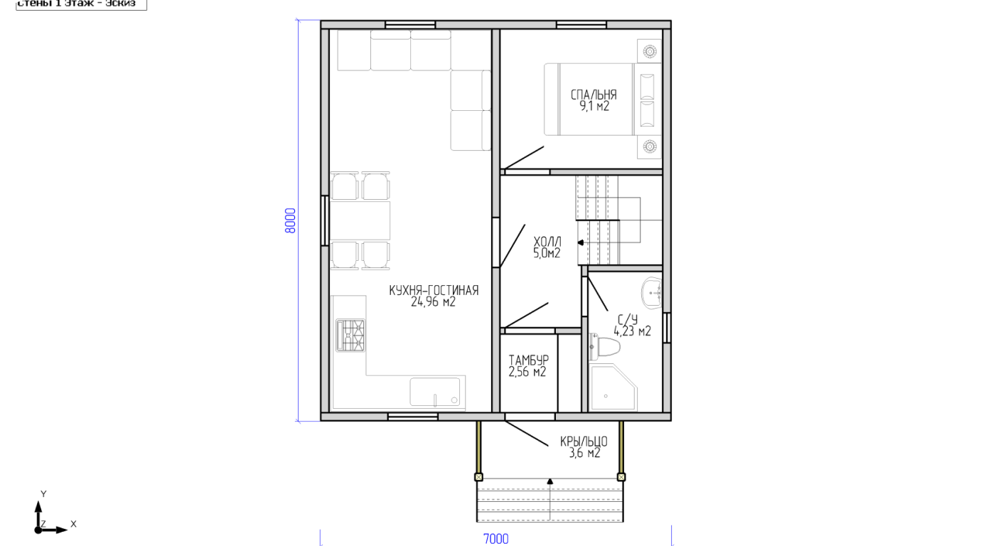 Вход в дом через крытое крыльцо, за ним тамбур, следом идет холл. В холле расположена лестница на второй этаж, а также двери в спальню, санузел и кухню-гостиную. Совмещенная с гостиной кухня продумана также и в плане освещения. Три окна расположены таким образом, чтобы освещать зону готовки, центральную часть помещения и зону отдыха.