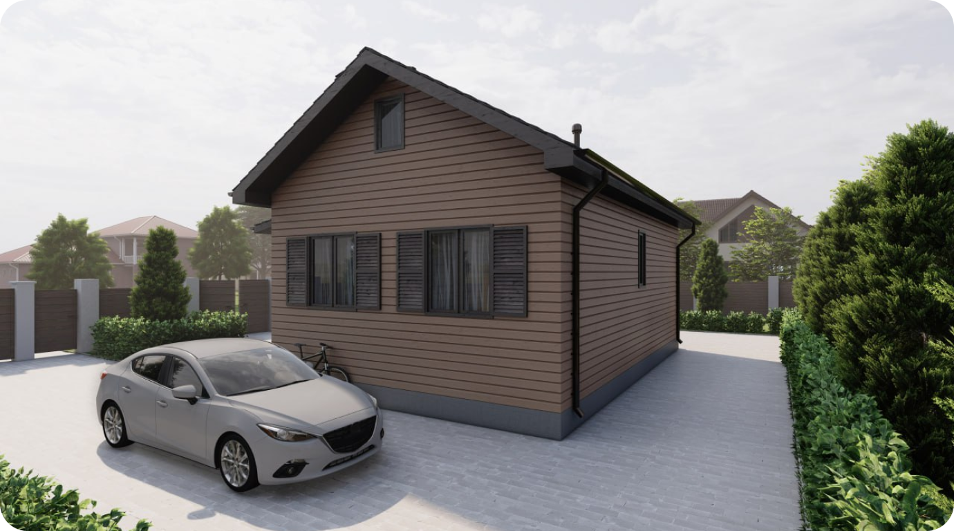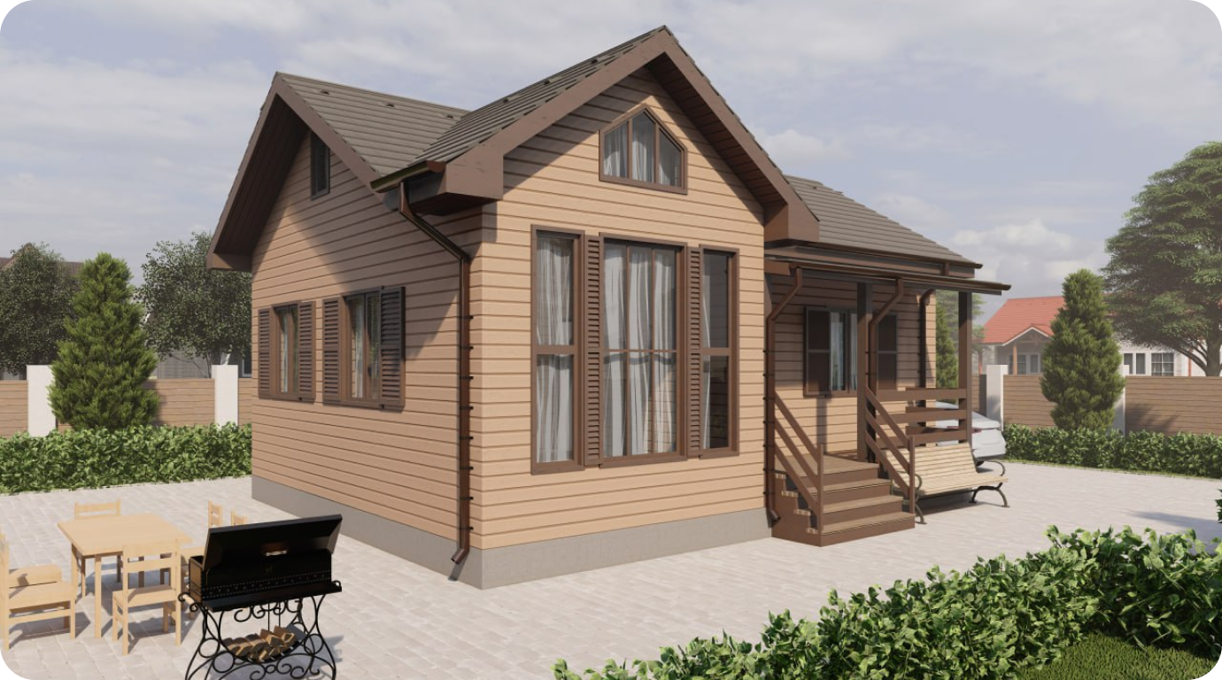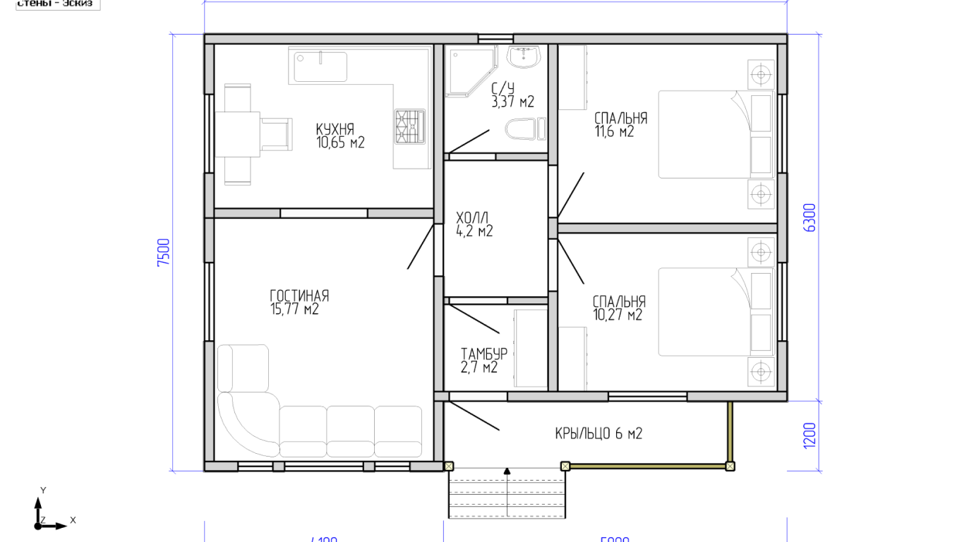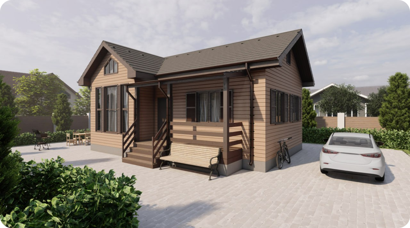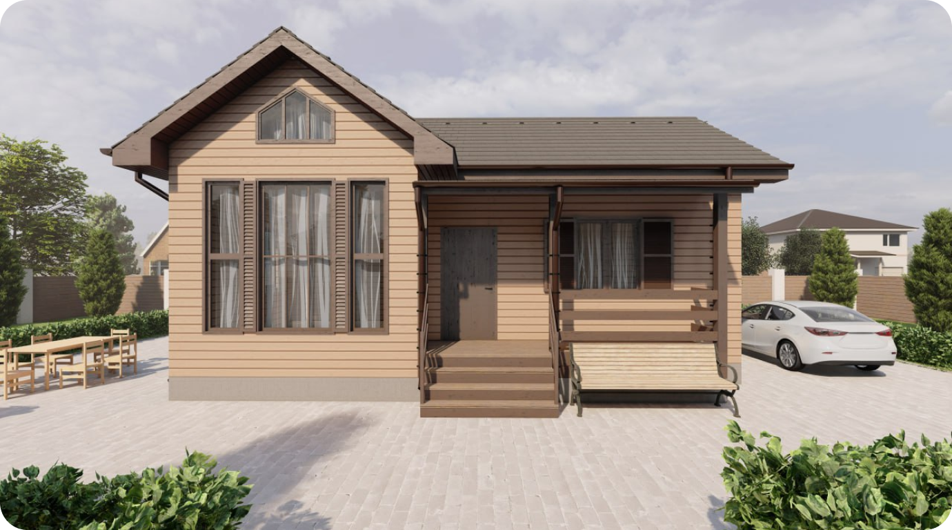 Одноэтажный дом с общей площадью 75 м², с двумя спальнями, и небольшим крытым крыльцом площадью 6 м²