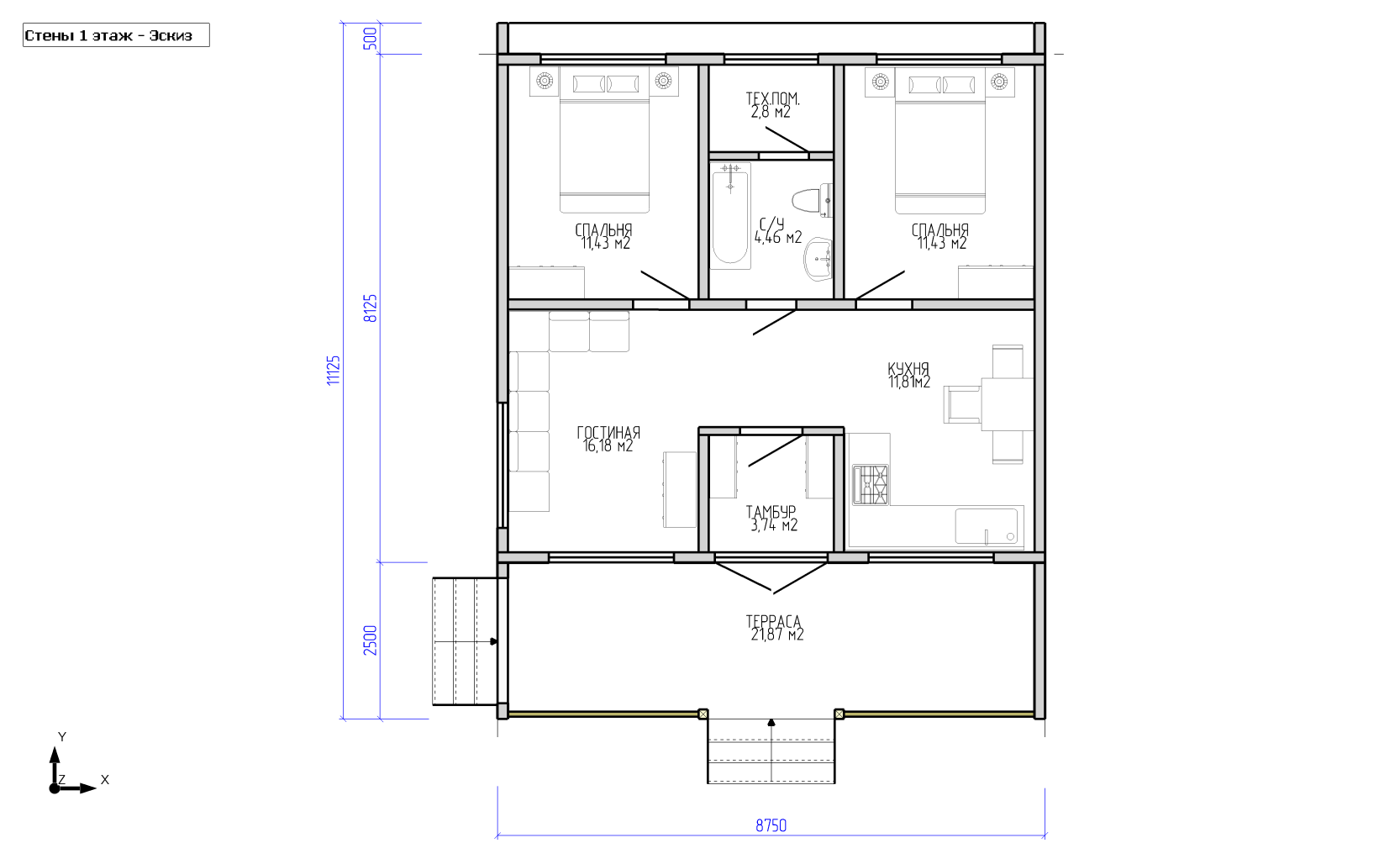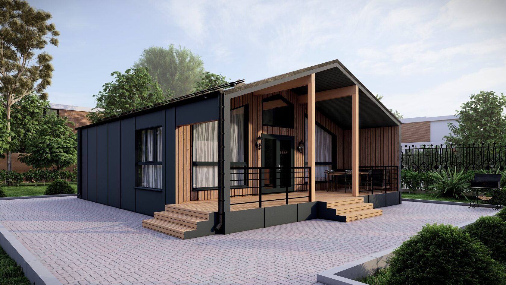 Благодаря продуманному устройству внутреннего объёма, в доме будет создана эргономичная среда для всех проживающих. Вход в дом через стильную террасу. Рядом со входом два панорамных окна и еще одно в зоне гостиной. С тамбура попадаем в небольшой холл, из которого можно попасть в санузел и две большие спальни. В спальнях также панорамные окна и большое окно под потолком в санузле.